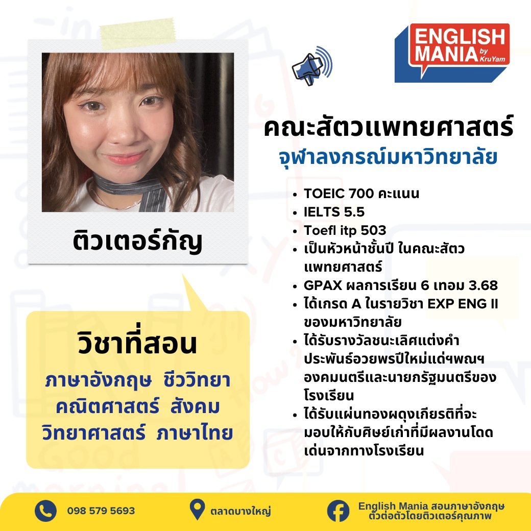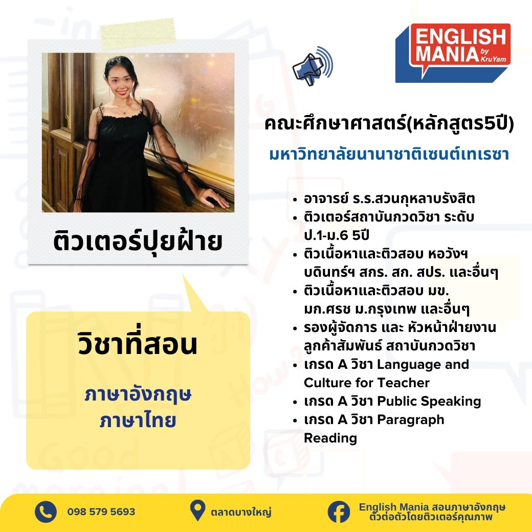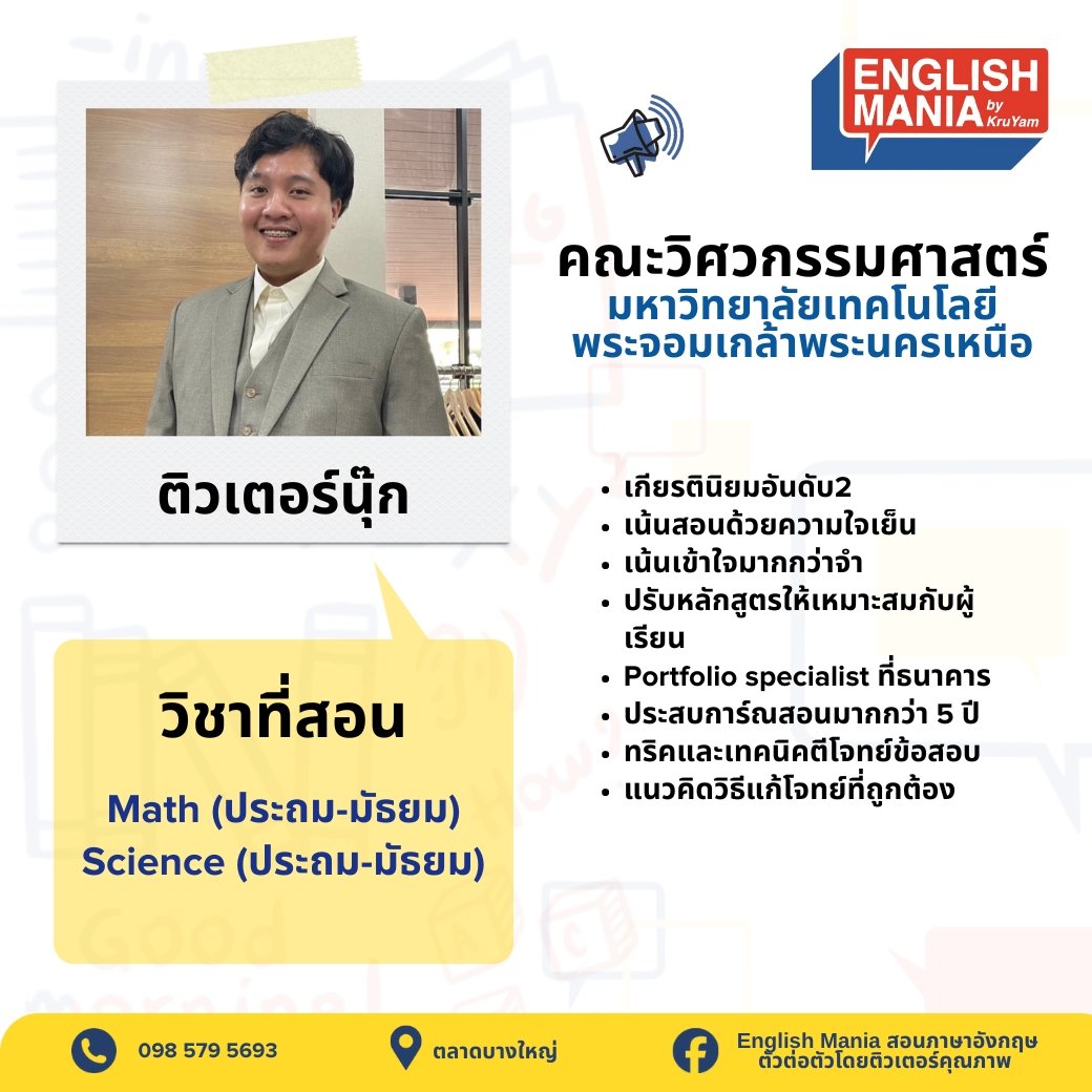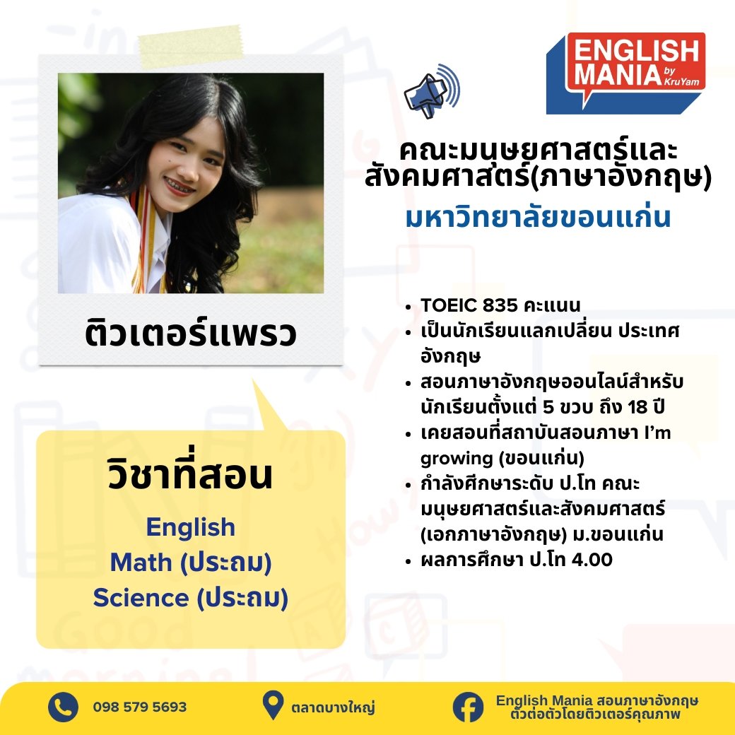 ยินดีต้อนรับสู่บริการติวเตอร์ส่วนตัวที่จะช่วยยกระดับการเรียนรู้ของเด็กๆ ทีมติวเตอร์ของเราประกอบด้วยผู้เชี่ยวชาญที่มีความรู้ลึกซึ้งในสาขาวิชาของตน พร้อมประสบการณ์การสอนที่หลากหลาย เรามุ่งมั่นที่จะปรับวิธีการสอนให้เหมาะกับรูปแบบการเรียนรู้เฉพาะของเด็กๆ ช่วยให้เข้าใจเนื้อหาที่ซับซ้อน เสริมจุดแข็ง และพัฒนาจุดที่ต้องปรับปรุง ด้วยการดูแลอย่างใกล้ชิดและการให้ข้อมูลย้อนกลับที่มีประโยชน์ เราจะช่วยให้เด็กๆ สร้างความมั่นใจในการเรียน พัฒนาทักษะการคิดวิเคราะห์ และบรรลุเป้าหมายทางการศึกษาของเด็กและผู้ปกครอง ไม่ว่าจะต้องการความช่วยเหลือในวิชาใด หรือเตรียมตัวสอบสำคัญ ติวเตอร์ของเราพร้อมที่จะเป็นพันธมิตรในการเรียนรู้ของคุณ มาเริ่มต้นการเดินทางสู่ความสำเร็จทางการศึกษาไปด้วยกันกับเรา