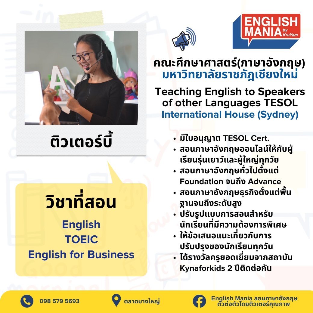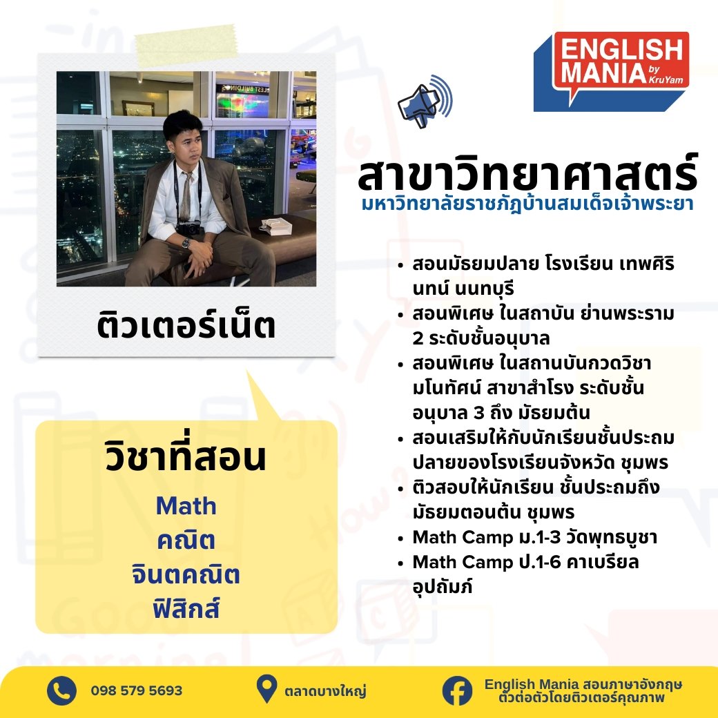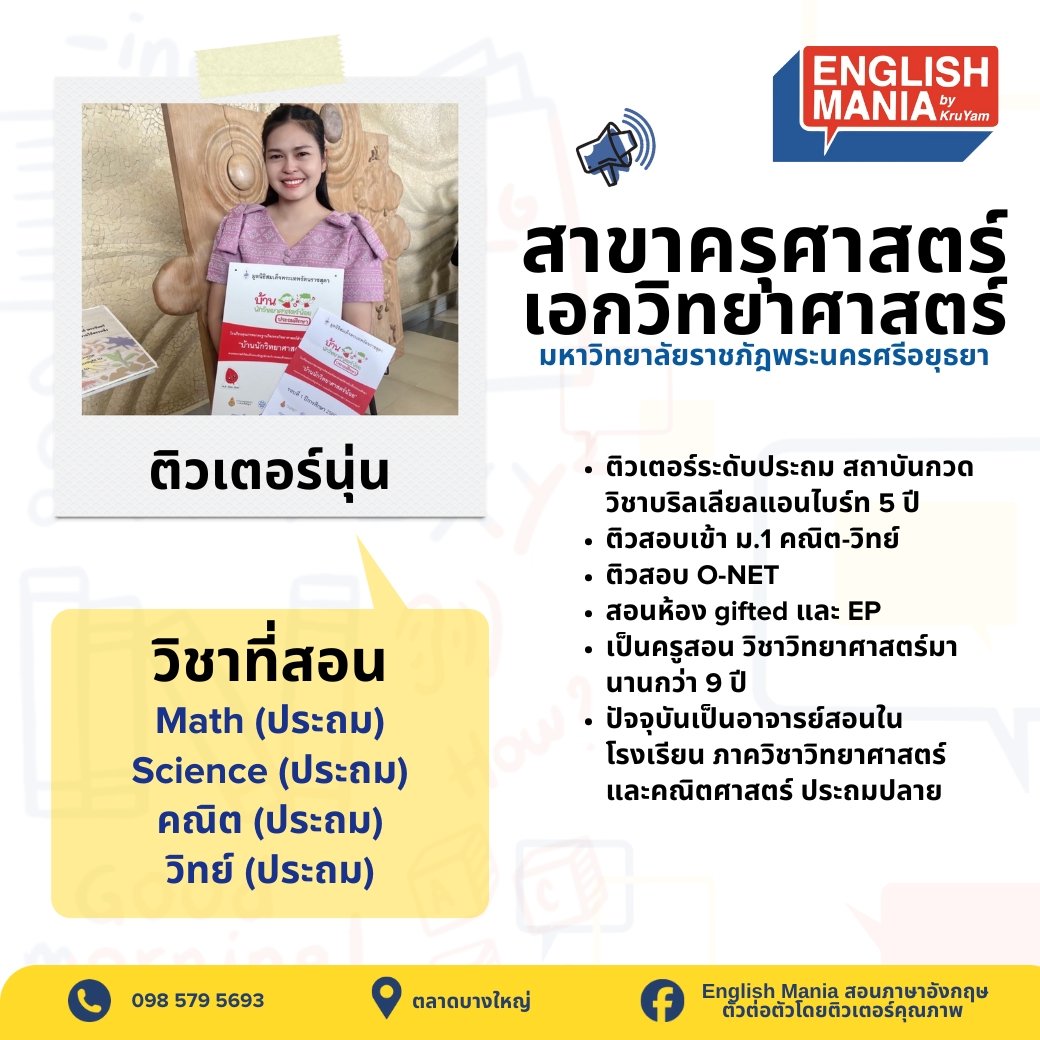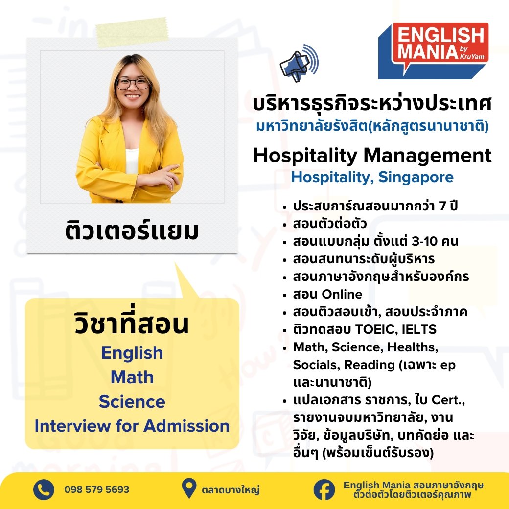 ยินดีต้อนรับสู่บริการติวเตอร์ส่วนตัวที่จะช่วยยกระดับการเรียนรู้ของเด็กๆ ทีมติวเตอร์ของเราประกอบด้วยผู้เชี่ยวชาญที่มีความรู้ลึกซึ้งในสาขาวิชาของตน พร้อมประสบการณ์การสอนที่หลากหลาย เรามุ่งมั่นที่จะปรับวิธีการสอนให้เหมาะกับรูปแบบการเรียนรู้เฉพาะของเด็กๆ ช่วยให้เข้าใจเนื้อหาที่ซับซ้อน เสริมจุดแข็ง และพัฒนาจุดที่ต้องปรับปรุง ด้วยการดูแลอย่างใกล้ชิดและการให้ข้อมูลย้อนกลับที่มีประโยชน์ เราจะช่วยให้เด็กๆ สร้างความมั่นใจในการเรียน พัฒนาทักษะการคิดวิเคราะห์ และบรรลุเป้าหมายทางการศึกษาของเด็กและผู้ปกครอง ไม่ว่าจะต้องการความช่วยเหลือในวิชาใด หรือเตรียมตัวสอบสำคัญ ติวเตอร์ของเราพร้อมที่จะเป็นพันธมิตรในการเรียนรู้ของคุณ มาเริ่มต้นการเดินทางสู่ความสำเร็จทางการศึกษาไปด้วยกันกับเรา